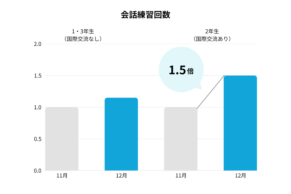 AIを活用した会話練習の課題において、国際交流を実施した2年生は「英会話の練習回数」が11月から12月にかけて約1.5倍、「英会話練習でのラリー数」が11月から12月にかけて約1.61倍の伸びを示しました。国際交流を実施していない同校の1年生・3年生の伸び(それぞれ、1.16倍・1.32倍)と比べて高い数字です。