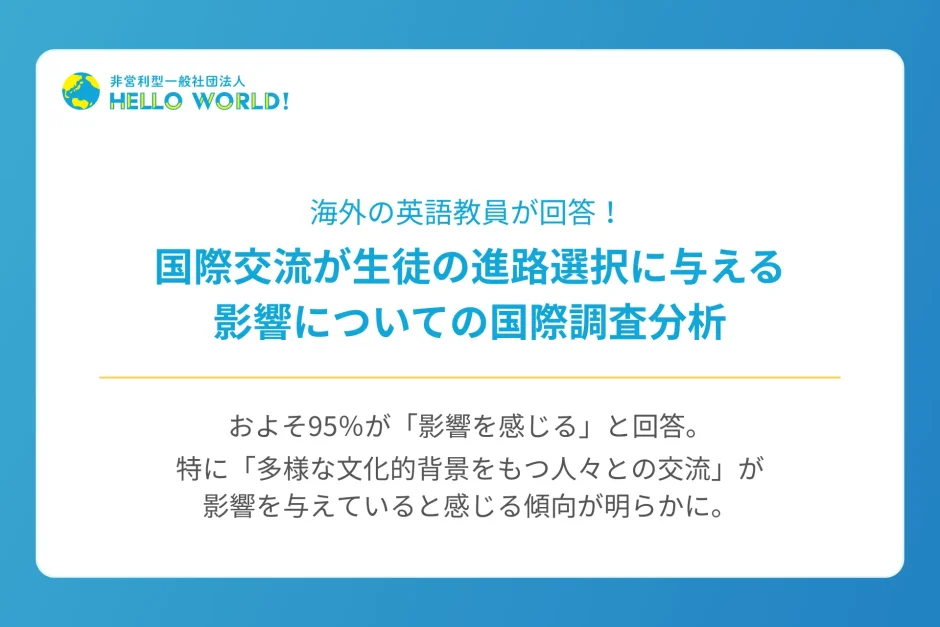 国際交流を起点に多様性あふれる社会の実現を目指す一般社団法人HelloWorld(ハローワールド、沖縄県沖縄市)は、国際交流や多文化理解等に関する調査・研究を推進するため、IntEx(*)研究所を設立しています。この度、連携先であるHelloWorld株式会社(本社:沖縄県沖縄市、Co-CEO野中光、冨田啓輔)が海外の提携校の英語教員に対して「国際交流が生徒の進路選択に与える影響に関する独自調査」を実施し、海外の教員45名から回答を得ました。IntEx研究所が独自にその内容を分析しましたので、結果を公表します。